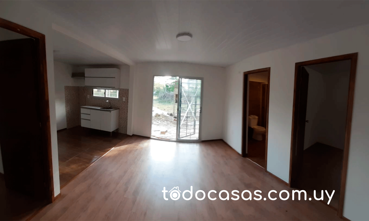 Casa-contenedor tipo cabaña de 48m2 con 2 dormitorios, estar, cocina integrada y baño completo.